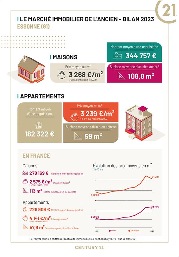 (Infographie du marché immobilier de l’ancien en 2023 dans l’Essonne - Crédits photo : CENTURY 21)